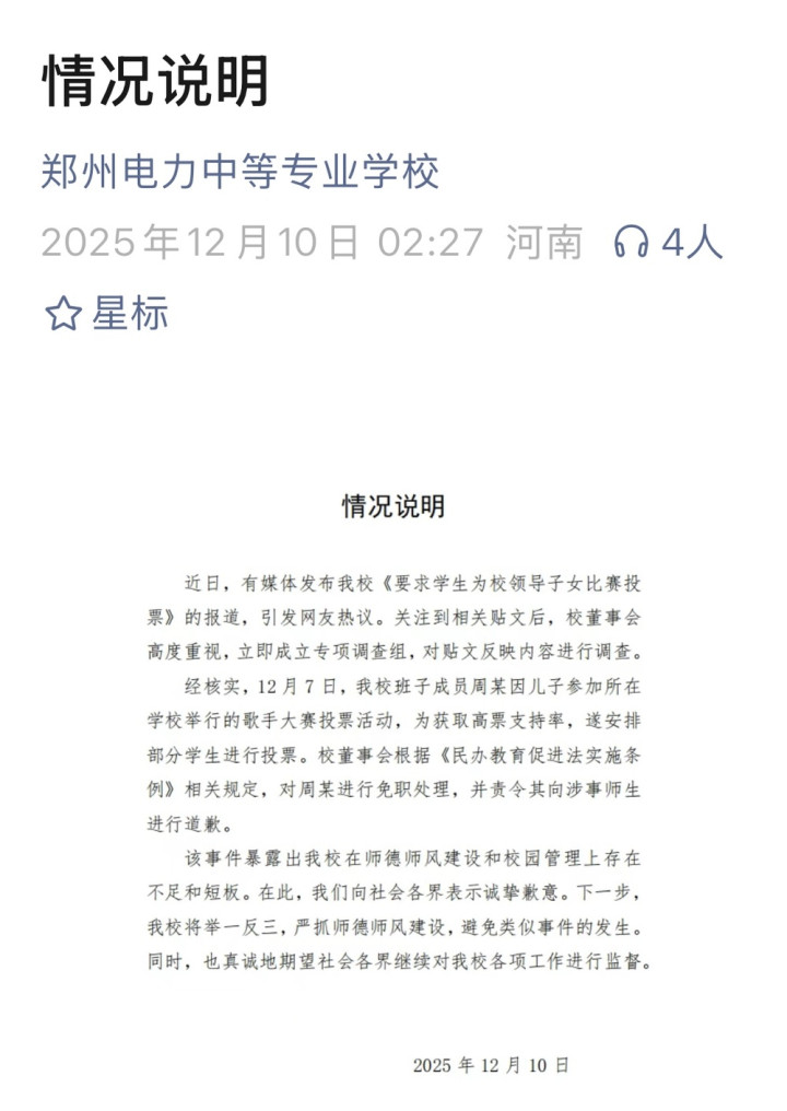 近日,郑州一行状学校要肄业生为校教养子女比赛投票一事激发烧议。郑州电力中等专科学校12月10日发布情况讲明,称对涉事教养免职处理,并责令其向涉事师生进行说念歉。