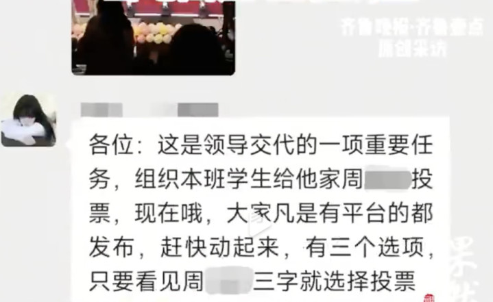 有学生发视频反应,其地方的班级群内有东说念主下发告知,号令给一位就读于浙江某大学的学生进行“校园十佳歌手”投票,称“这是教养打法的一项热切任务,组织本班学生给他家周某某投票,但凡有平台的都发布”,群内的该发布东说念主还暗示,“惟有看见周某某三个字就袭取投票”。随后,博主又发布了一则班主任条目删除视频的本体。并附文“学校教养强制条目删视频。”